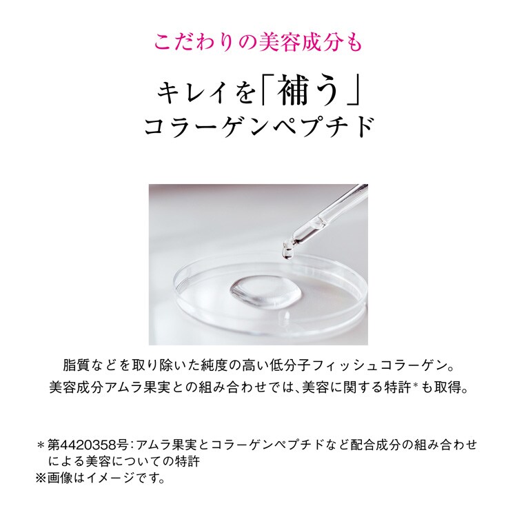 ●低分子フィッシュコラーゲン5000mg、スーパー果実由来の特許成分(コケモモ+アムラ果実)に加え、トマト種子エキス、桜の花エキス、ヒアルロン酸、ビタミンCなど7種の美容成分を配合。