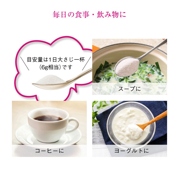 ・1日1回約6g(大さじ1杯強)程度を目安に、お好きな飲み物や食べ物に溶かして、よく混ぜてお召し上がりください。