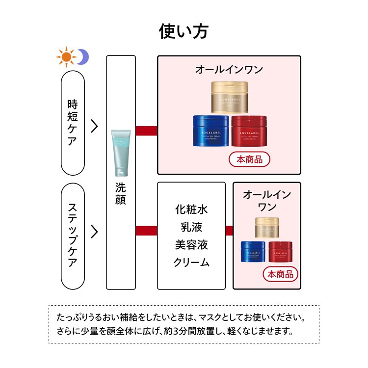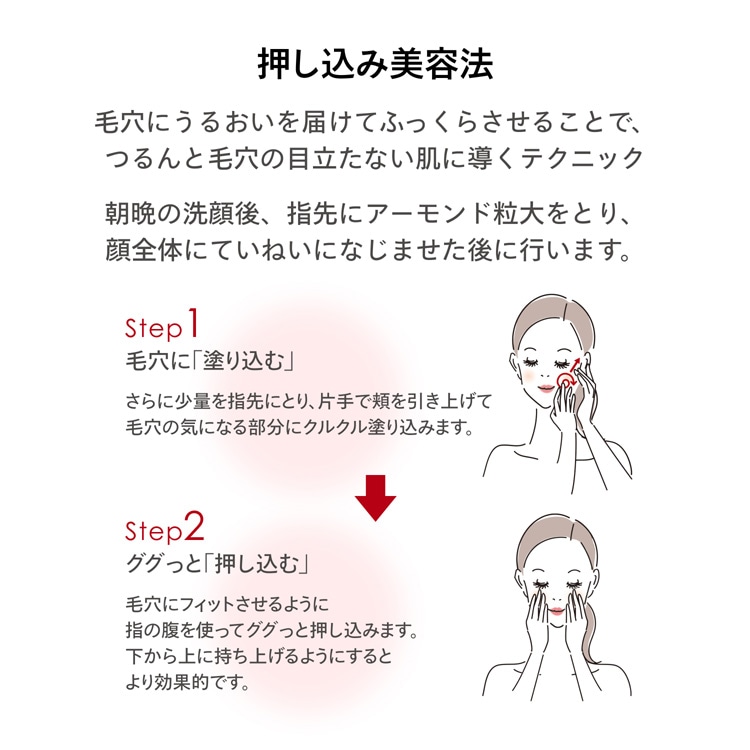 ・朝晩の洗顔の後、指先に適量をとり、顔全体になじませます。たっぷりうるおい補給をしたいときには、マスクとしてお使いください。さらに少量を顔全体に広げ、約3分間放置し、軽くなじませます。