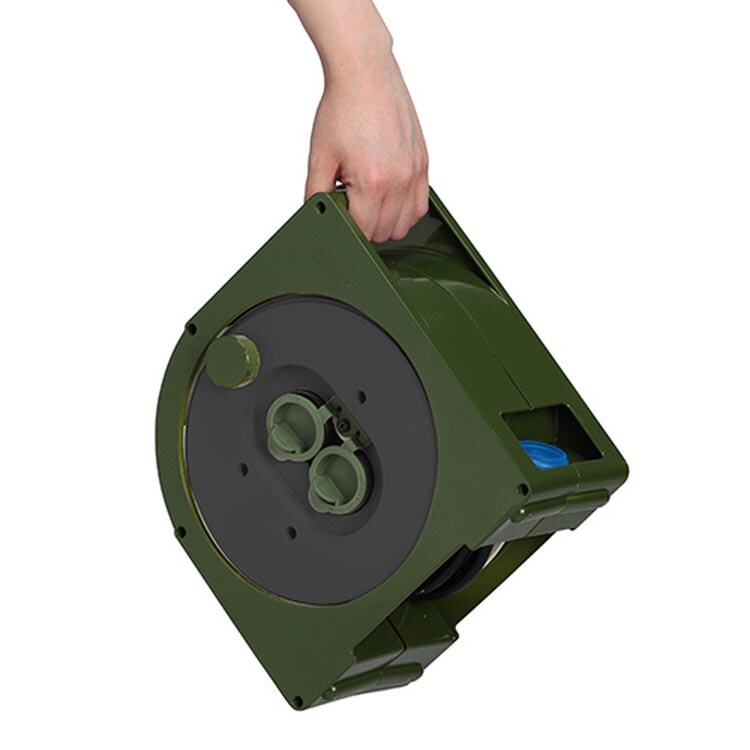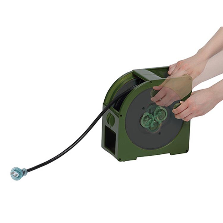 ●10mの延長コードが、約23cmの寸法に小さくまとまり(厚みもたったの14cm)収納性が高く、片付けの際はコードに触れず巻取りできる為手が汚れません。