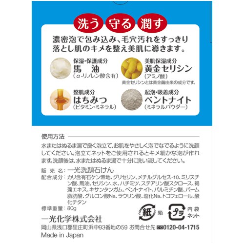 | カリ含有石けん素地、グリセリン、メチルグルセス-10、ミリスチン酸、馬油、セリシン、水、ハチミツ、ステアリン酸スクロース、褐藻エキス、キサンタンガム、ベントナイト、パルミチン酸、パーム脂肪酸、グルコン酸Na、ラウリン酸、塩化Na、トコフェロール、酸化チタン |