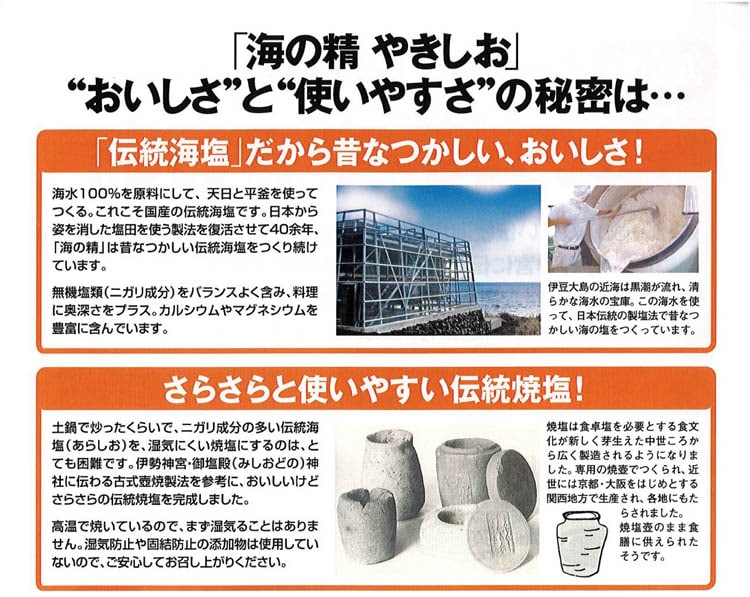 ●にがり分の多い自然海塩を完全な焼塩にするのはとても困難ですが、伊勢神宮・御塩殿神社に伝わる古式製法を再現することで「海の精」ならではのミネラルたっぷりの本格焼塩を完成しました。