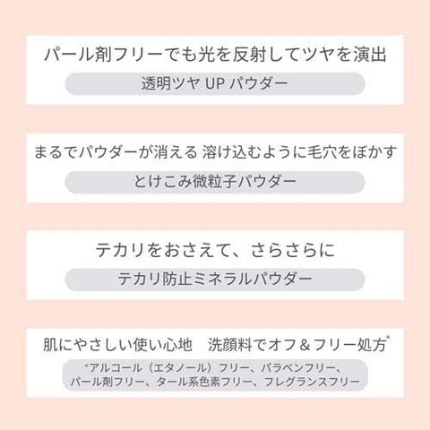 ●テカリをおさえて、さらさらの透明ツヤ肌に。テカリ防止ミネラルパウダー、透明ツヤパウダー配合