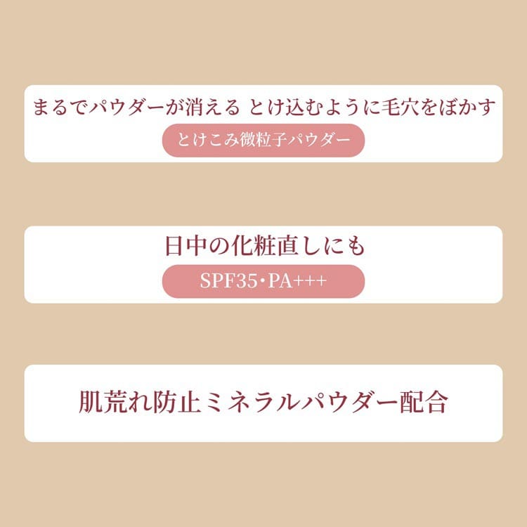 | 成分:タルク、酸化チタン、メトキシケイヒ酸エチルヘキシル、ミリスチン酸Mg、シリカ、ナイロン-12、(ジフェニルジメチコン/ビニルジフェニルジメチコン/シルセスキオキサン)クロスポリマー、アルガニアスピノサ核油、ホホバ種子油、アセチルヒアルロン酸Na、ヒアルロン酸Na、月見草油、カルボキシデシルトリシロキサン、メタクリル酸メチルクロスポリマー、セスキイソステアリン酸ソルビタン、ジメチコン、(ビニルジメチコン/メチコンシルセスキオキサン)クロスポリマー、ステアリン酸Mg、ハイドロゲンジメチコン、含水シリカ、水酸化Al、トリエトキシカプリリルシラン、塩化亜鉛、ケイ酸(Li/Mg/Na)、水、グリセリン、ジステアリルジモニウムクロリド、トコフェロール、ホウケイ酸(Ca/Al)、テトラヒドロテトラメチルシクロテトラシロキサン、BHT、テトラデセン、クロルフェネシン、合成金雲母、マイカ、硫酸Ba、酸化鉄 <M144784-202> |