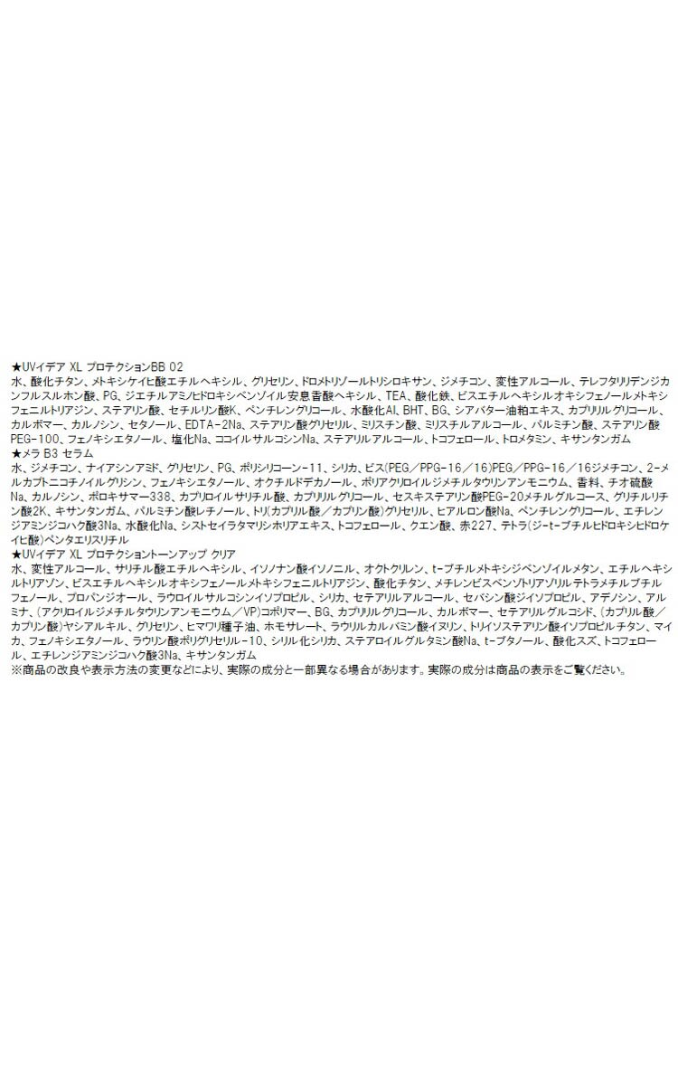 | UVイデア XL プロテクションBB 02 30mL (BBクリーム/現品) メラ B3 セラム 3mL(美容液/サンプル) UVイデア XL プロテクショントーンアップ クリア 3mL(化粧下地/サンプル) |
