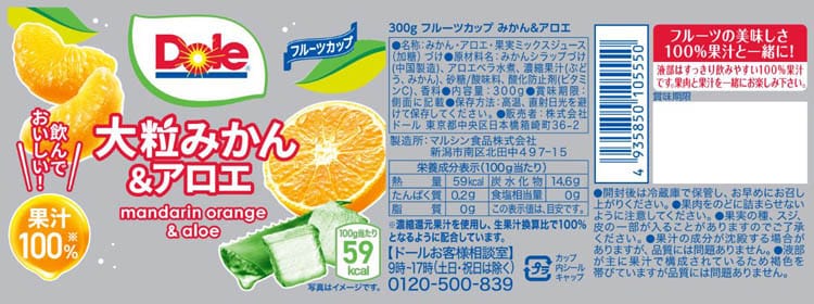 | みかんシラップづけ(中国製造)、アロエベラ水煮、濃縮果汁(ぶどう、みかん)、砂糖/酸味料、酸化防止剤(ビタミンC)、香料 |