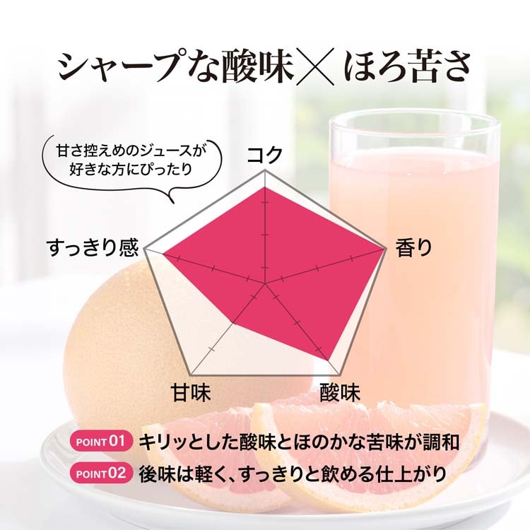 ●太陽の恵みを受けて育った厳選グレープフルーツ果汁100%~独特の苦味を抑えて後味すっきりの果汁100パーセントグレープフルーツジュースです。