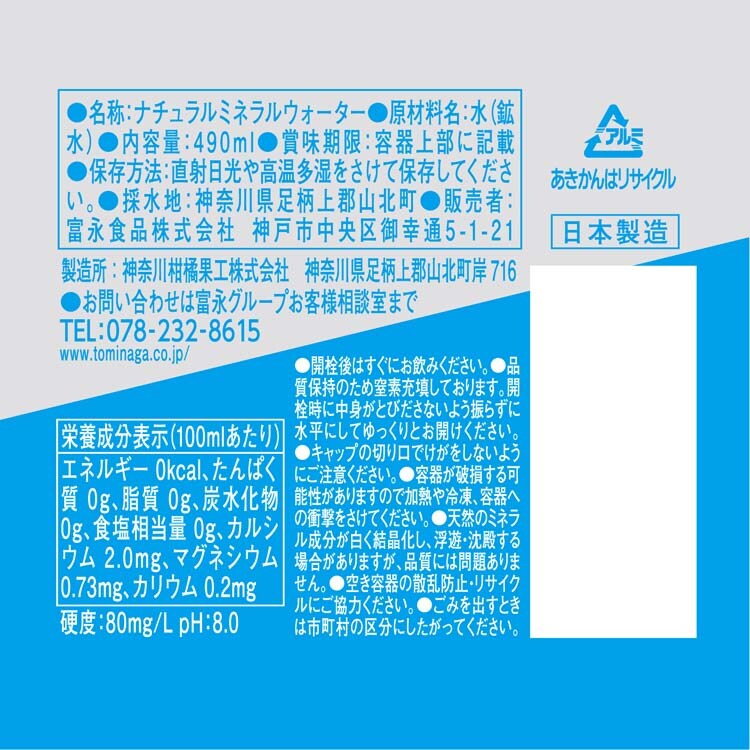 トミナガ ナチュラルミネラルウォーター ボトル缶 (490ml×24本入)
