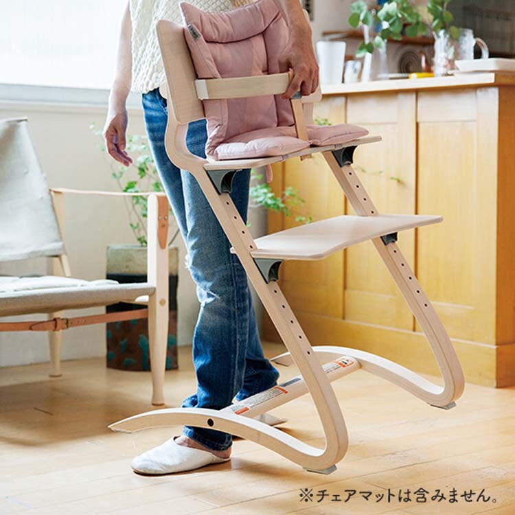 ●滑らかな曲線で構成され、前後にわずかに動くように設計されたリエンダー社のハイチェア。座面の高さは11段階で調整いただくことができ、背もたれと足置きの高さも調整できるので、大人にとっても、快適な座り心地の椅子となります。