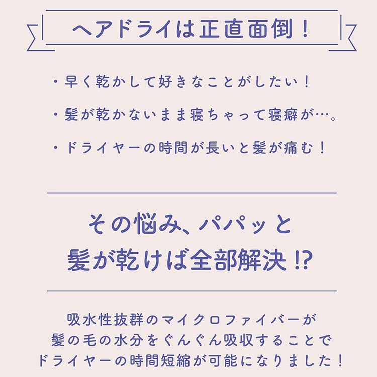 ●お風呂上がりの救世主!毎日めんどうなドライヤーの時間をもっと短くしたい・・・そんな思いを叶えてくれるヘアドライタオルです。