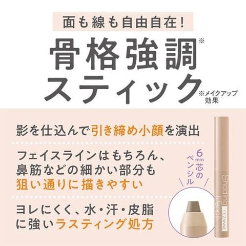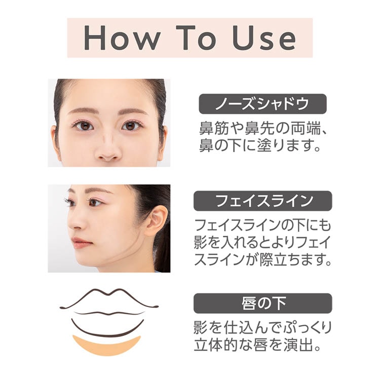 ・4mm程度繰り出して影を入れたい鼻やフェイスラインに塗布して指やパフなどでなじませてください。
