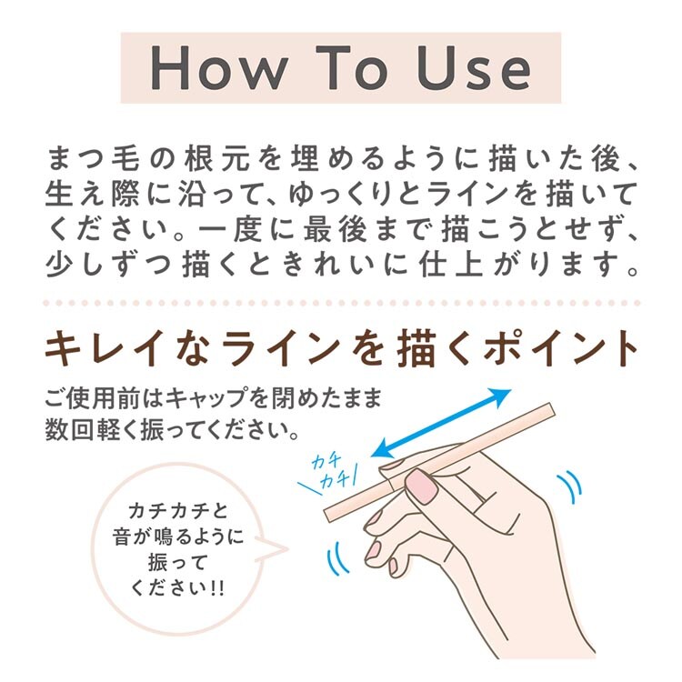 ・まつ毛の根元を埋めるように描いた後、生え際に沿って、ゆっくりとラインを描いてください。