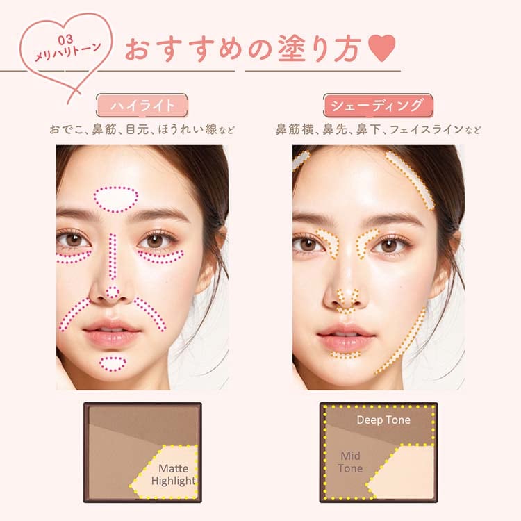 ●自然な陰影をプラスするマットハイライト入りシェーディングパレット。入れたい部分に合わせて濃淡・色味をぴったり調節できます。