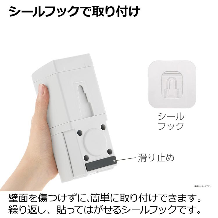 ●シールフックにかけるだけの簡単設置です。好きな場所に付けれて、壁に浮かせておけるので清潔です。