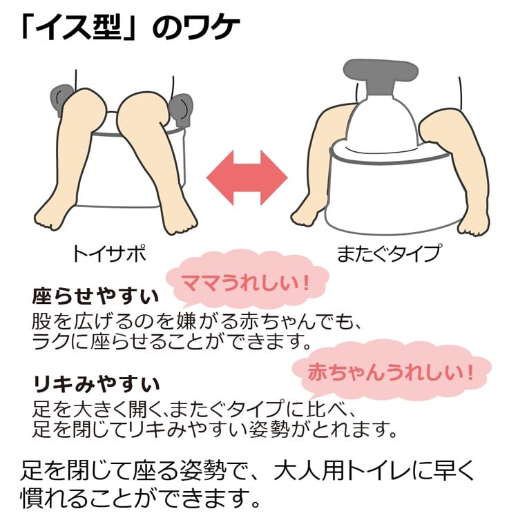 ●足を閉じて座る姿勢で、大人用トイレに早く慣れることができます。