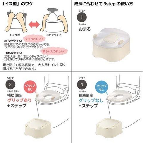 | 対象年齢: おまる:1才頃~ 補助便座(グリップ付):1才6カ月頃~4才頃 補助便座(グリップなし):2才頃~4才頃 ステップ:1才6カ月頃~6才頃 体重目安: おまる:20kgまで 補助便座:20kgまで ステップ:30kgまで サイズ:34.5×33×20.5H(cm) 材質:ポリプロピレン、熱可塑性エラストマー、他 抗菌加工 |