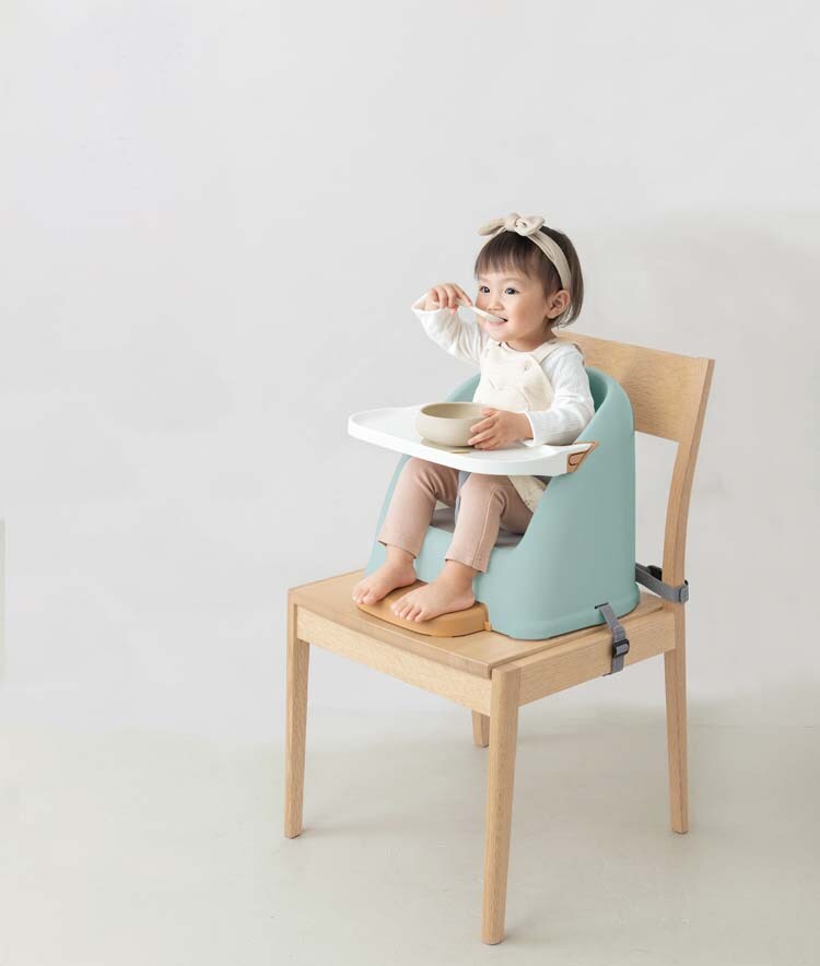 ●お行儀の良い姿勢で食事に集中できる。背もたれ、ステップ、座面シートで姿勢をサポートするブースターチェアです。