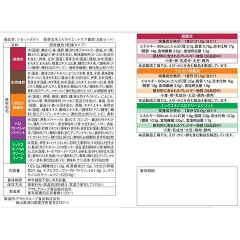 | ★鯛雑炊:米(国産)、鯛ほぐし身、鶏卵、難消化性デキストリン、食塩、みつ葉、鯛エキス、醤油(小麦・大豆を含む)、風味調味料(かつお(乳成分 )を含む)、押麦、玄米(国産)、発芽玄米(国産)、豚脂、赤米(国産)、もちきび、もちあわ、椎茸エキス、はと麦、酵母エキス末/調味料(アミノ酸等)、糊料(加工デンプン、増粘多糖類)、酸化防止剤(V.E) ★松茸雑炊:米(国産)、難消化性デキストリン、まつたけ水煮、食塩、水菜、風味調味料(かつお)(乳成分を含む)、醤油(小麦・大豆を含む)、押麦、玄米(国産)、発芽玄米(国産)、ゆず果皮、赤米(国産)、もちきび、もちあわ、はと麦、椎茸エキス、豚脂、あさりエキス、昆布粉末、酵母エキス末/調味料(アミノ酸等)、糊料(加工デンプン、キサンタン)、酸化防止剤(V.C、V.E)、pH調整剤、香料 ★うま出汁卵雑炊:米(国産)、押麦、鶏卵、鶏肉、難消化性デキストリン、にんじん、ほうれん草、風味調味料(かつお)(乳成分を含む)、食塩、玄米(国産)、醤油(小麦・大豆を含む)、豚脂、ホタテエキス、発芽玄米(国産)、椎茸エキス、酵母エキス末/調味料(アミノ酸等)、糊料(加工デンプン、キサンタン)、酸化防止剤(V.E、V.C)、香料 ★ナスとブロッコリーのトマトリゾット:米(国産)、押麦、トマトペースト、揚げなす、ブロッコリー、難消化性デキストリン、鶏肉、トマトパウダー、配合調味料(小麦・大豆を含む)、バター、食塩、玄米(国産)、砂糖、かきエキス調味料、香辛料、発芽玄米(国産)、酵母エキス末/調味料(アミノ酸等)、糊料(加工デンプン、キサンタン)、着色料(カロテノイド、カラメル、ウコン)、酸化防止剤(V.E)、酸味料、pH調整剤、香辛料抽出物 ★ミックスキノコのクリームリゾット:米(国産)、押麦、まいたけ、ぶなしめじ、乳等を主要原料とする食品(大豆を含む)、難消化性デキストリン、えのき茸、バター、食塩、配合調味料(小麦・鶏肉を含む)、玄米(国産)、チーズパウダー、ポークエキス、全粉乳、香辛料、発芽玄米(国産)、酵母エキス末、乾燥パセリ/調味料(アミノ酸等)、糊料(加工デンプン、キサンタン)、香料、酸化防止剤(V.E)、酸味料、ウコン色素、香辛料抽出物 |