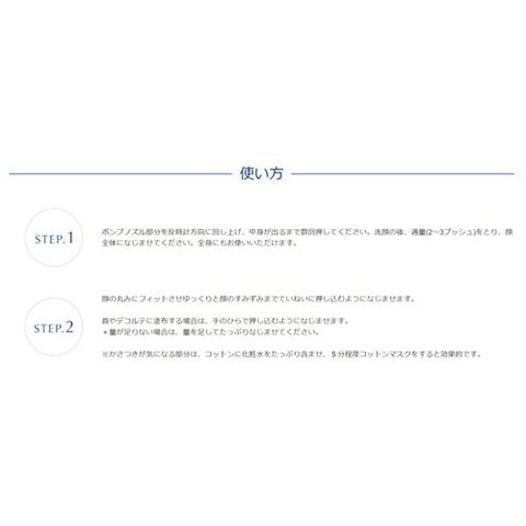 ポンプノズル部分を反時計方向に回し上げ、中身が出るまで数回押してください。洗顔の後、適量(2~3プッシュ)をとり、顔全体になじませてください。全身にもお使いいただけます。