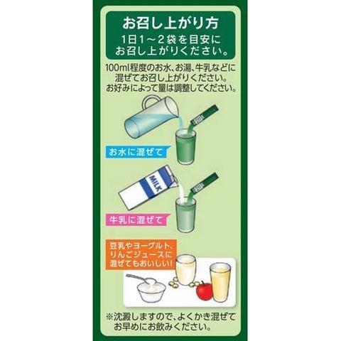 100mL程度の水や牛乳によく溶かしてお召し上がりください。→100ml程度のお水、お湯、牛乳などに混ぜてお召し上がりください。