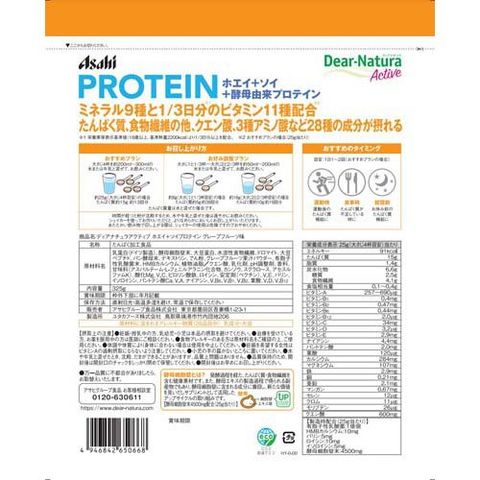 | 25gあたり エネルギー:91kcal、たんぱく質:15g、脂質:1.4g、炭水化物:6.6g、―糖質:2.5g、―食物繊維:4.1g、食塩相当量:0.1~0.4g、ビタミンA:257~690μg、ビタミンB1:0.4mg、ビタミンB2:0.47mg、ビタミンB6:0.44mg、ビタミンB12:2.0μg、ビタミンC:34mg、ビタミンD:3.2μg、ビタミンE:2.9mg、ナイアシン:4.4mg、パントテン酸:2.0mg、葉酸:120μg、カルシウム:284mg、マグネシウム:107mg、鉄:2.9mg、銅:0.21mg、亜鉛:2.1mg、マンガン:0.67mg、セレン:10μg、クロム:9μg、モリブデン:24μg 栄養成分情報(枠外) クエン酸:600mg 製造時配合(25g当たり) 有胞子性乳酸菌:1億個、HMBカルシウム:10mg、バリン:5mg、ロイシン:10mg、イソロイシン:5mg、酵母細胞壁末:4500mg |
