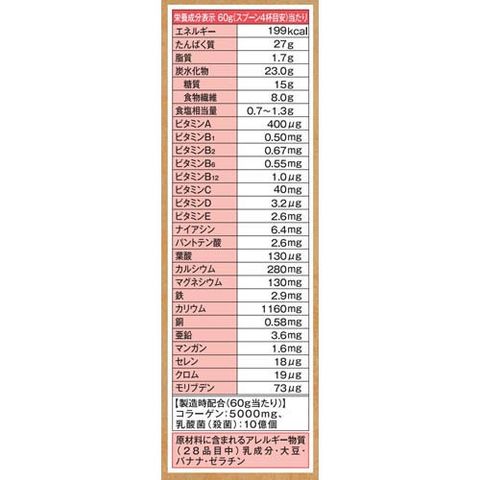 | 60g(スプーン4杯目安)当たり エネルギー:199kcal、たんぱく質:27g、脂質:1.7g、炭水化物:23.0g、―糖質:15g、―食物繊維:8.0g、食塩相当量:0.7~1.3g、ビタミンA:400μg、ビタミンB1:0.50mg、ビタミンB2:0.67mg、ビタミンB6:0.55mg、ビタミンB12:1.0μg、ビタミンC:40mg、ビタミンD:3.2μg、ビタミンE:2.6mg、ナイアシン:6.4mg、パントテン酸:2.6mg、葉酸:130μg、カルシウム:280mg、マグネシウム:130mg、鉄:2.9mg、カリウム:1160mg、銅:0.58mg、亜鉛:3.6mg、マンガン:1.6mg、セレン:18μg、クロム:19μg、モリブデン:73μg ★製造時配合(60g当たり) コラーゲン:5000mg、乳酸菌(殺菌):10億個 |
