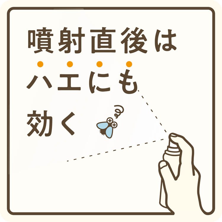 ・4.5畳から8畳あたり1回の噴射で蚊成虫には約12時間、ハエ成虫には噴射直後のみ有効です。