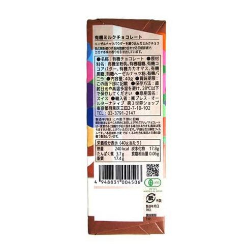 | 有機全粉乳、有機粗糖、有機ココアバター、有機カカオマス、有機黒糖、有機ヘーゼルナッツ粉、有機バニラ |