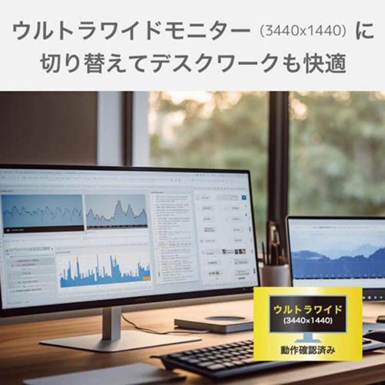 ●本製品は、ウルトラワイドモニターUWQHD (3440×1440)、UWFHD (2560×1080)に対応しています。ウルトラワイドモニターは1台で広々と使えるため、作業の効率化、デスクの省スペース化にもおすすめです。