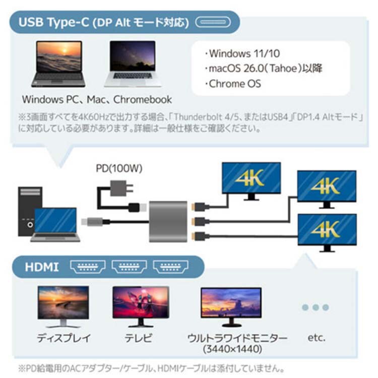 ※3画面すべてを4K(3840×2160)/60Hzで出力する場合、パソコンのUSB Type-C/USB-Cポートが「Thunderbolt 4、Thunderbolt5、またはUSB4」「DP1.4 Altモード」に対応している必要があります。