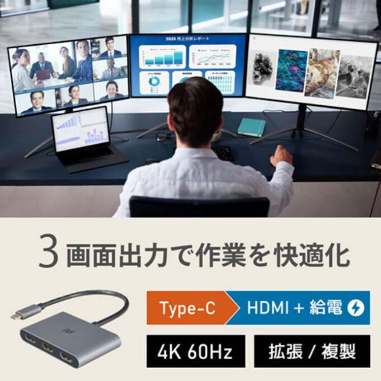 ●本製品を使用すれば、Type-Cポートひとつで手軽にトリプルディスプレイ環境が実現できます。