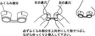 ・必ずふくらみ部分を上向きにして指でつぶしながらゆっくりと挿入してください。