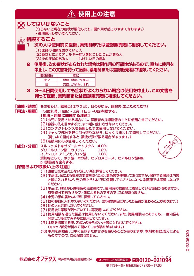 (3)本品は、無色から微褐色の点眼薬です。使用時に微褐色に着色している場合がありますが、有効成分であるサルファ剤によるものですので、ご心配ありません。