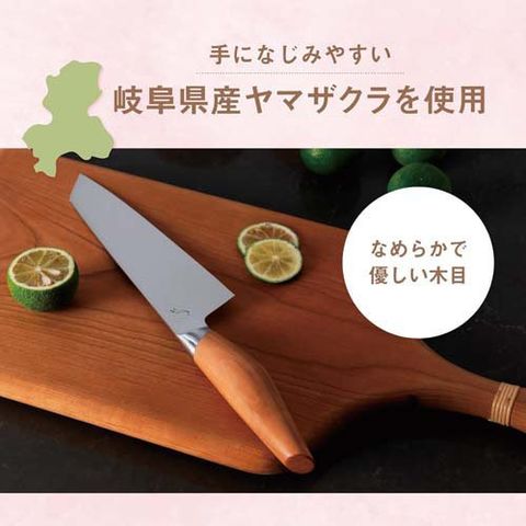 | サイズ(約):全長30.5cm、刃渡り16.5cm 本体重量(約):100g 素材・材質:刀身/全鋼ハイカーボンステンレス特殊鋼、口金/ステンレス、ハンドル/岐阜県産ヤマザクラ(天然木) |