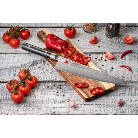 | サイズ:全長/約37cm、刃渡り/約23.5cm 本体重量:約0.235kg 素材・材質:黒積層強化木、超硬質合金鋼V金10号(32層特殊鋼) |