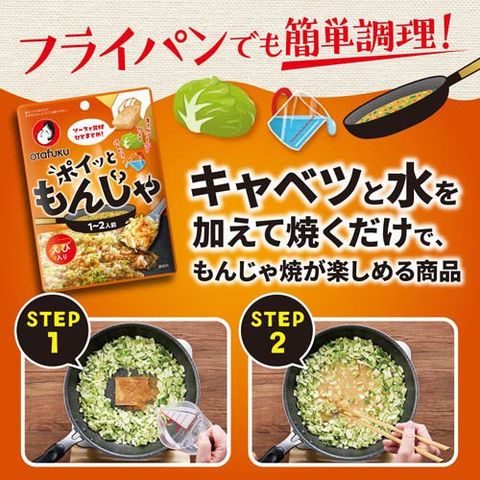 ●キャベツと水を加えて焼くだけで、もんじゃ焼が楽しめる商品です。