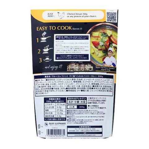 | ココナッツミルク、野菜(玉ねぎ、エシャロット、にんにく、しょうが)、イエローカレーペースト(レモングラス、にんにく、植物油脂、エシャロット、タマリンドペースト、コリアンダーの根、食塩、その他)、 ココナッツシュガー、フィッシュソース、植物油脂、タマリンドペースト、砂糖、香辛料、食塩、えびペースト、(一部にえび・小麦・大豆を含む) |