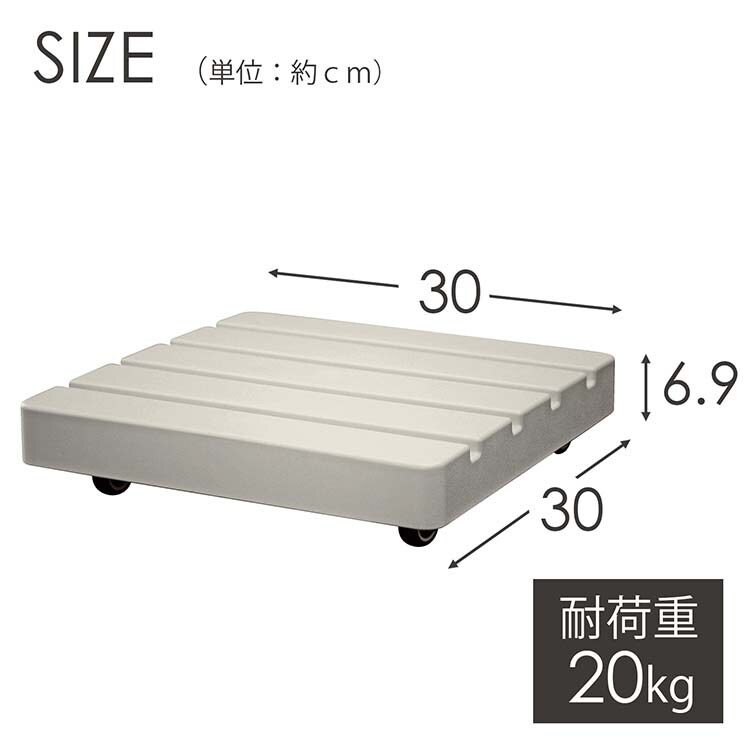 | ・本体重量(g):約750g ・素材・材質:(本体)ポリプロピレン樹脂、(キャスター)鉄・エラストマー ・耐荷重:20kg/ゴム製キャスター使用 ・サイズ:約30*30*6.9cm |