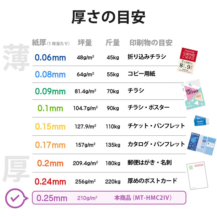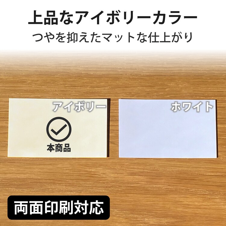 | ・用紙:インクジェット用紙 ・カラー:アイボリー ・用紙サイズ:W91×D55mm(名刺サイズ) ・入数:120枚 ・坪量:210g/平方メートル ・紙厚:0.245mm |