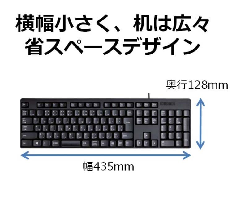 | ・インターフェイス:USB ・コネクタ形状:USB(A)オス ・対応機種:USBポートを装備したPC/AT互換機 ・対応OS:Windows 10、Windows 8.1、Windows 8、Windows 7、Windows Vista、Windows XP ※各OSの最新バージョンへのアップデートや、サービスパックのインストールが必要になる場合があります。 ・カラー:ブラック ・キータイプ:メンブレン ・キー配列:日本語109キー ・キーピッチ:19.0mm ・キーストローク:2.8mm ・電源方式:USBバスパワー ・ケーブル長:1.5m ・外形寸法:幅435.0mm*奥行128.0mm*高さ23.7mm(スタンド含まず)/幅435.0mm*奥行128.0mm*高さ35.4mm(スタンド時) ・サイズ分類:フル ・質量:約563g ・保証期間:6カ月 |
