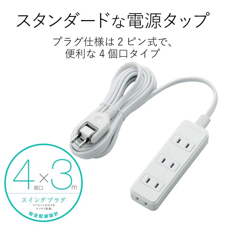 【エレコム 延長コード 電源タップ 3m 2P 4個口 スタンダード スイング T-TS02-2430WHの商品詳細】