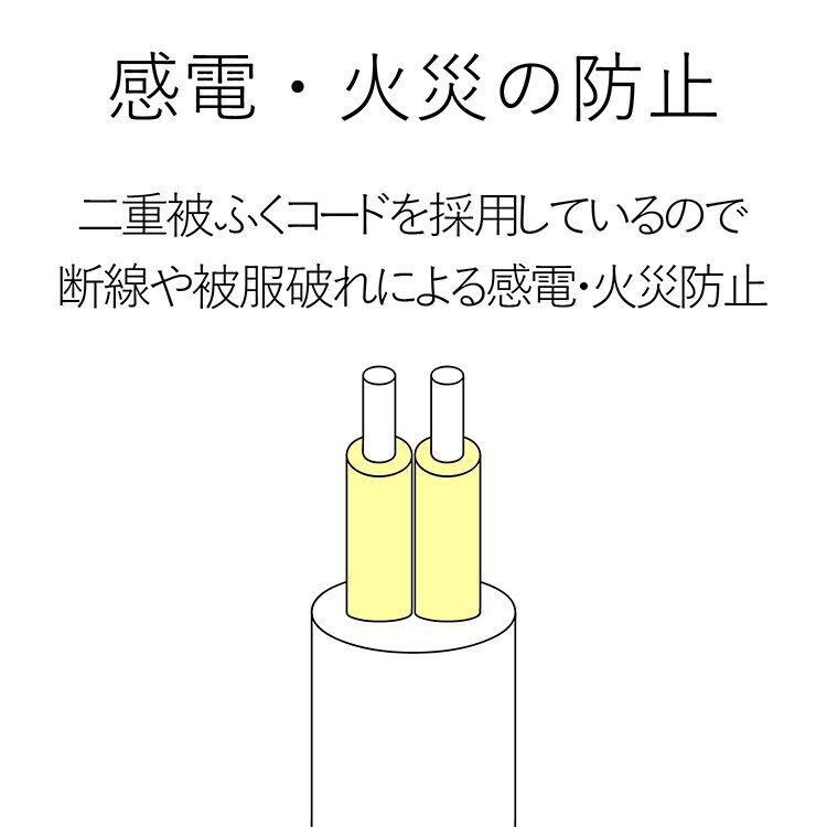 ●電源コードには一般社団法人日本配線システム工業会規格(JWDS0010)に適合した二重被ふくコードを採用しており、断線や被ふく破れによる感電・火災の防止に有効です。