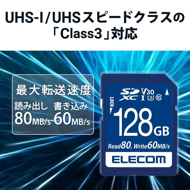 ●高速インターフェース規格であるUHS-I/UHSスピードクラスの「Class3」/ビデオスピードクラスV30、および読み書き時の最低速度を保証するSDスピードクラスの「class10」に対応したSDカードです。