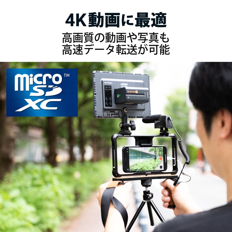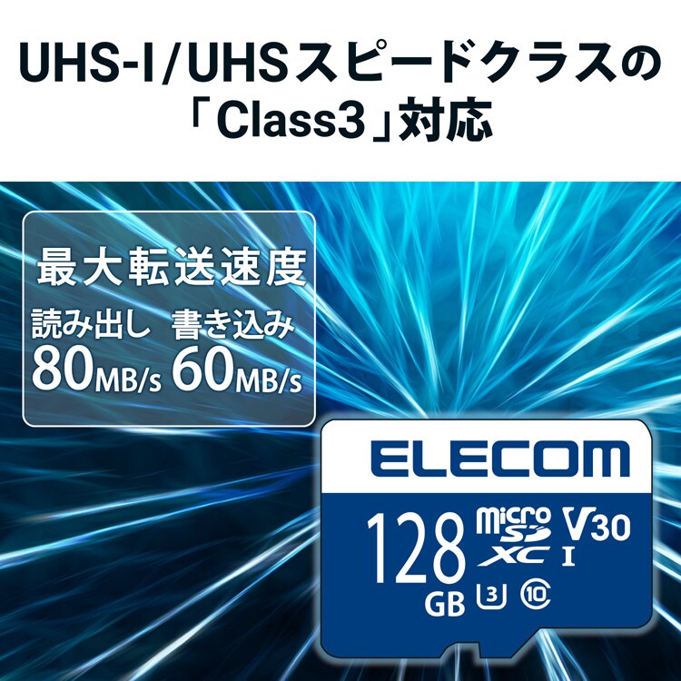●高速インターフェース規格であるUHS-I/UHSスピードクラスの「Class3」/ビデオスピードクラスV30、および読み書き時の最低速度を保証するSDスピードクラスの「class10」に対応したmicroSDカードです。