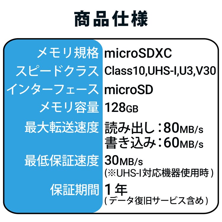 | メモリ規格:microSDXC スピードクラス:Class10、UHS-I、U3、V30 インターフェイス:microSD メモリ容量:128GB 最大転送速度:読み出し:80MB/s、書き込み:60MB/s 最低保証速度:30MB/s(※UHS-I対応機器使用時) 外形寸法:幅15.0mm*高さ11.0mm*奥行1.0mm 重量:約0.4g 付属品:SD変換アダプタ*1 保証期間:1年(データ復旧サービス含む) |