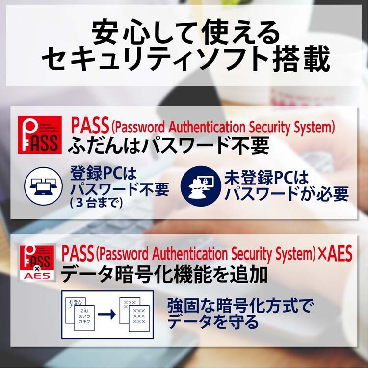 ●「PASS(Password Authentication Security System)*AES」使用時は、保存されたデータは、信頼性の高い強固な暗号化方式「AES256bit」で暗号化されるので、万一の紛失や盗難でも大切なデータの情報流出を防止します。