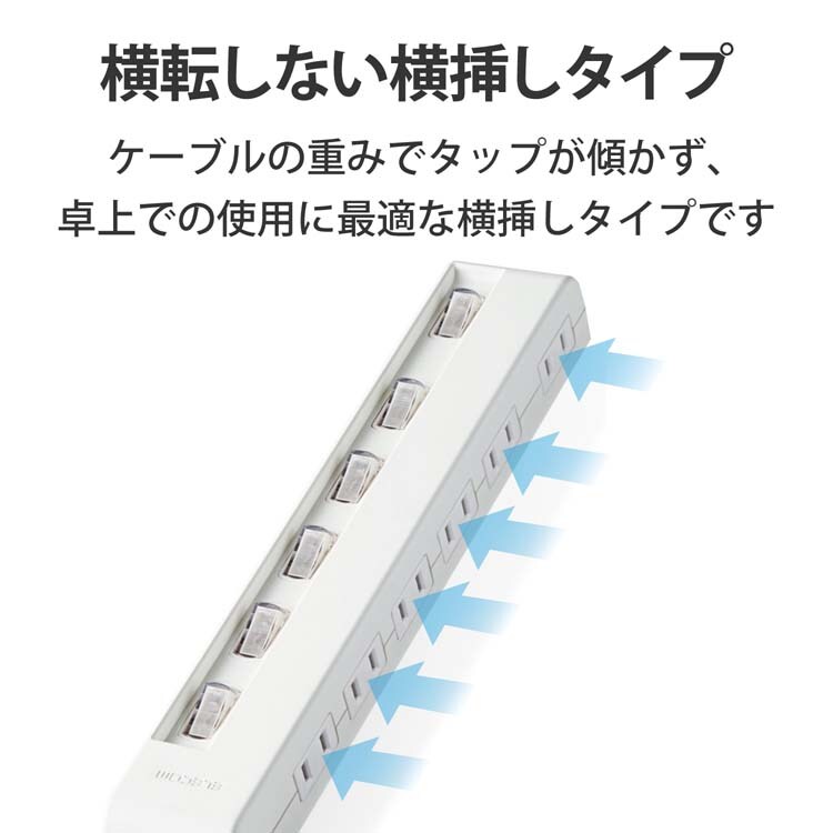 ●タップに差し込んだケーブルの重みでタップが傾いたりすることがなく、卓上での使用に最適な横挿しタイプ