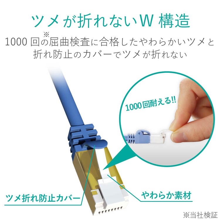 ●ツメ折れ防止プロテクタと屈曲に対する耐久性が高いコネクタを採用したダブル構造で、通常の使用環境ではツメが折れないLANケーブルです。※1000回の屈曲検査に合格(メーカー検証)