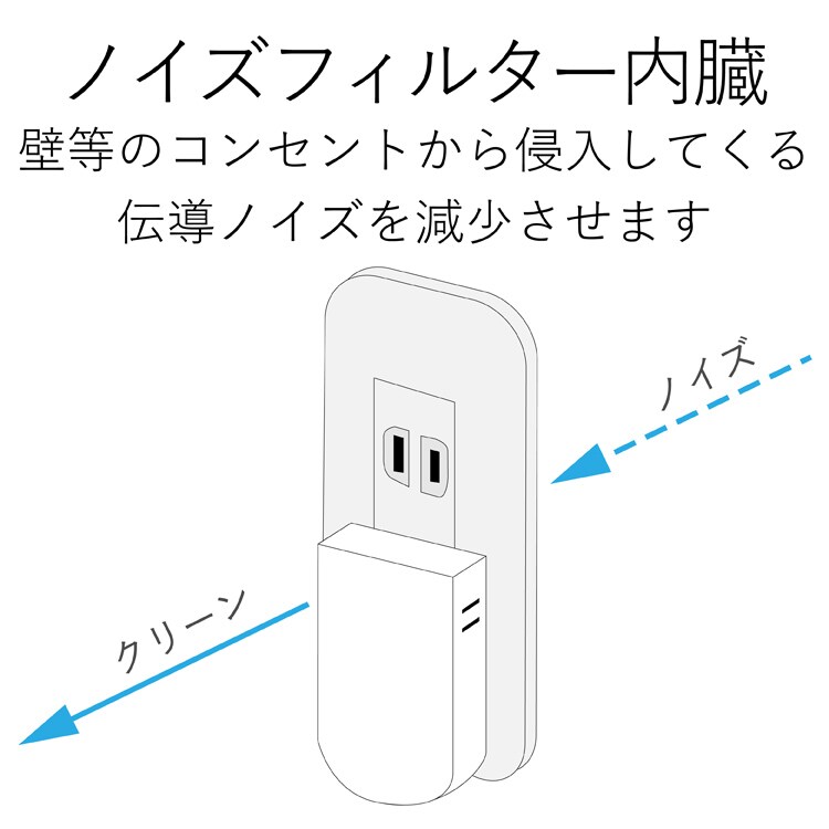 サージ吸収素子内蔵で雷サージから接続機器を守る、2P式2個口の雷サージ対応OAタップです。12500V(最大サージ電圧)を制限電圧470Vに抑えます。※直撃雷を受けた場合は保護できません。壁などのコンセントから侵入してくる伝導ノイズを減少させるノイズフィルターを内蔵しています。プラグの先端の角度を自由に変えることができるので、配線がしやすくなります。