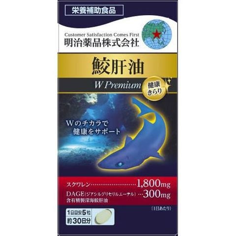 | 5粒3.000mg当たり エネルギー:22.2kcal、たんぱく質:0.65g、脂質:2.09g、炭水化物:0.20g、食塩相当量:0g、クワレン1.800mg、DAGE含有精製深海鮫肝油300mg |